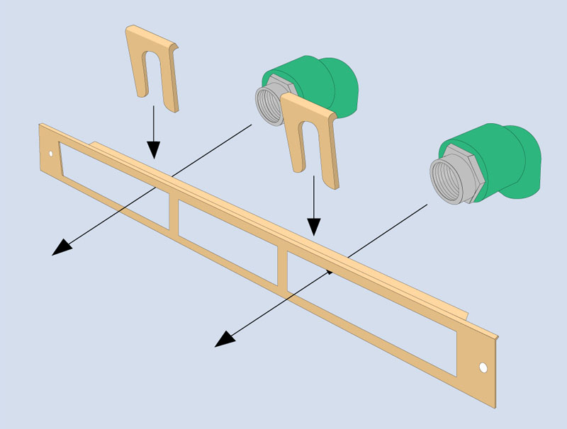 El conjunto se arma introduciendo los codos por la ranura de la planchuela del lado de la nervadura, hasta que hagan tope y fijándolos por delante de la misma con los seguros que se deslizan por la muesca del accesorio de arriba hacia abajo, hasta que el doblez del mismo toca con la nervadura de la planchuela