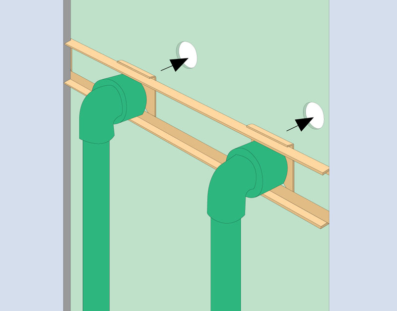 Estos soportes permiten fijar los codos a una altura predeterminada y con la separación correspondiente al artefacto a conectar. También se inmoviliza así esta parte de la instalación , algo que antes era resuelto solamente por el oficio e ingenio del instalador.