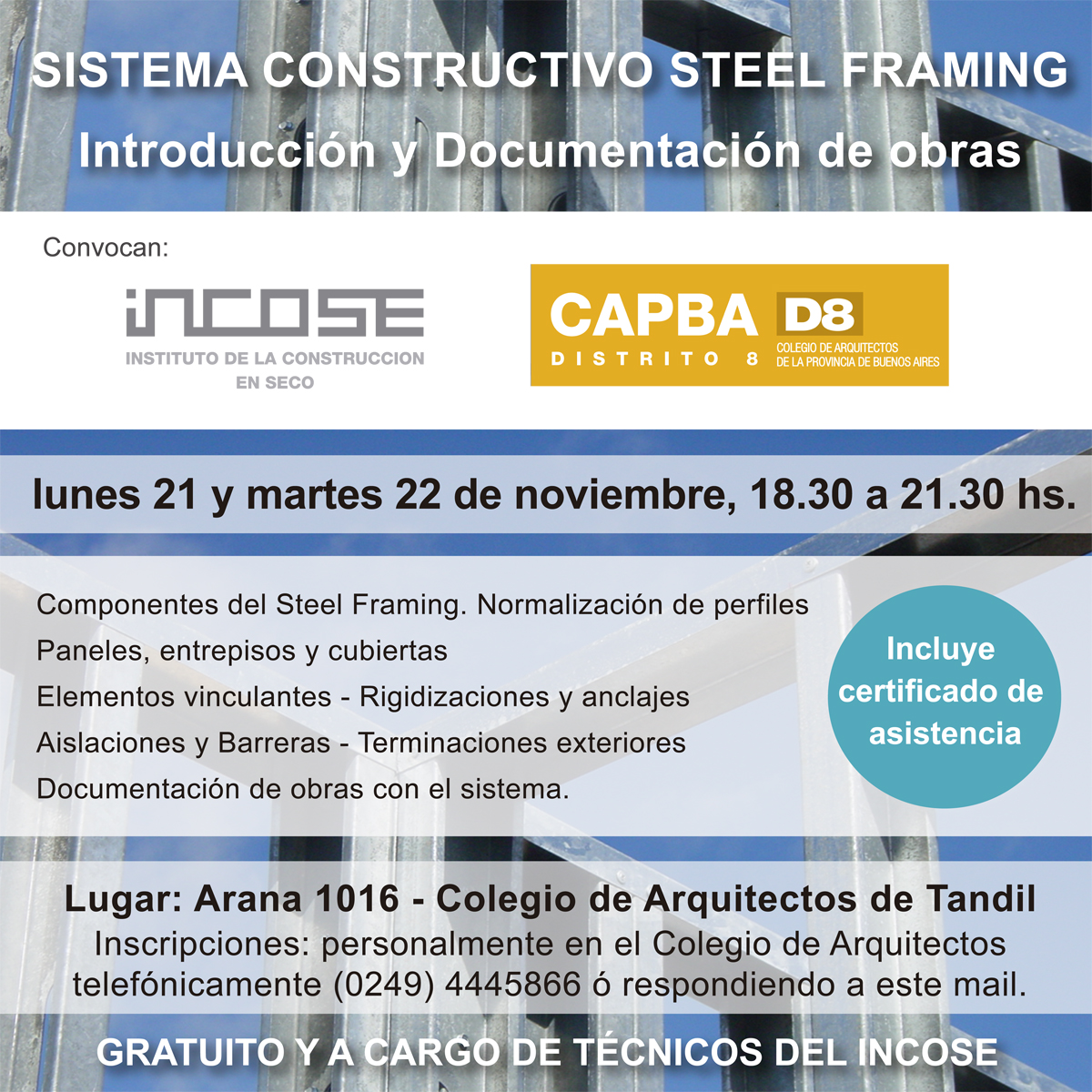 El lunes 21 y martes 22 estaremos dictando un curso sobre Introducción al Steel Framing y Documentación de Obras en el Colegio de Arquitectos de Tandil, organismo junto al cual estamos organizando este encuentro.