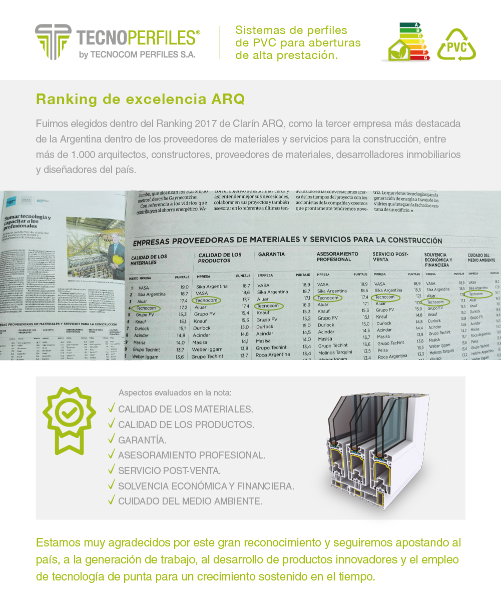 La firma Tecnoperfiles fue elegida dentro del Ranking 2017 de Clarín ARQ como la tercer empresa destacada de Argentina dentro de los proveedores de materiales y servicios para la construcción.